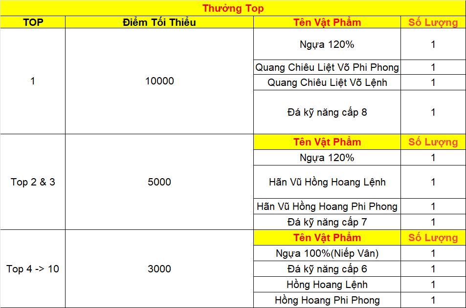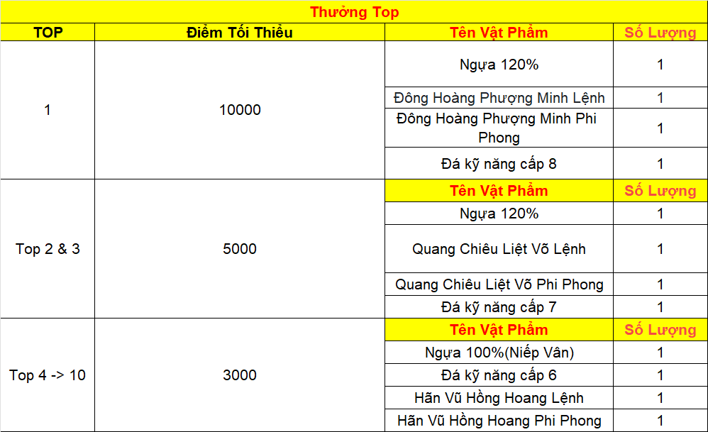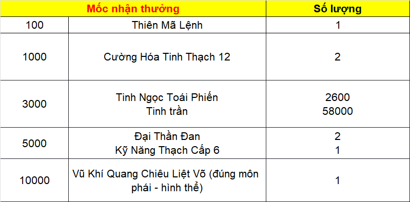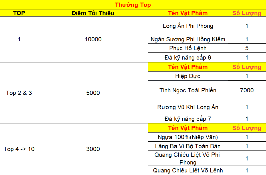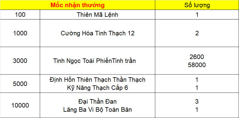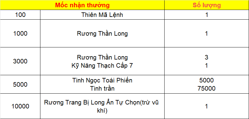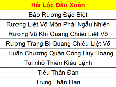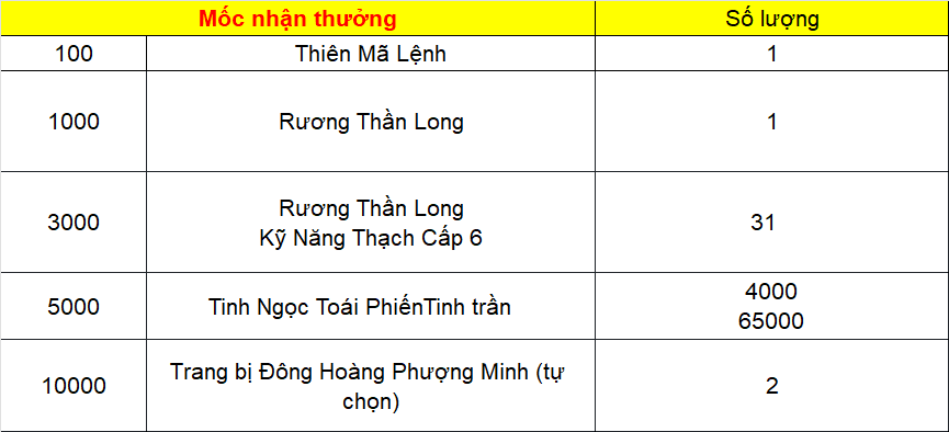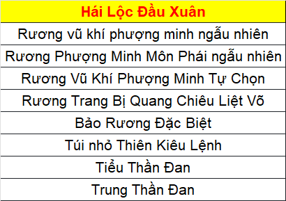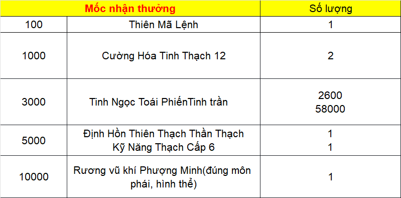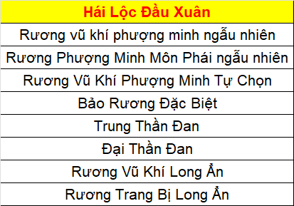 Phần thưởng máy chủ Tử Quang, Thái Hư, Hoa Sơn, Thanh Long, Tàng Kiếm, Vân Trung, Chu Tước, Bạch Hổ, Huyền Vũ, Thiếu Lâm, Thánh Linh Thành, Hưng Khánh, Hoàng Long Phủ, Táng Tuyết Thành, Đào Hoa Đảo, Tàng Long là: 2.000.000 exp và 1 phần thưởng trong các ô.