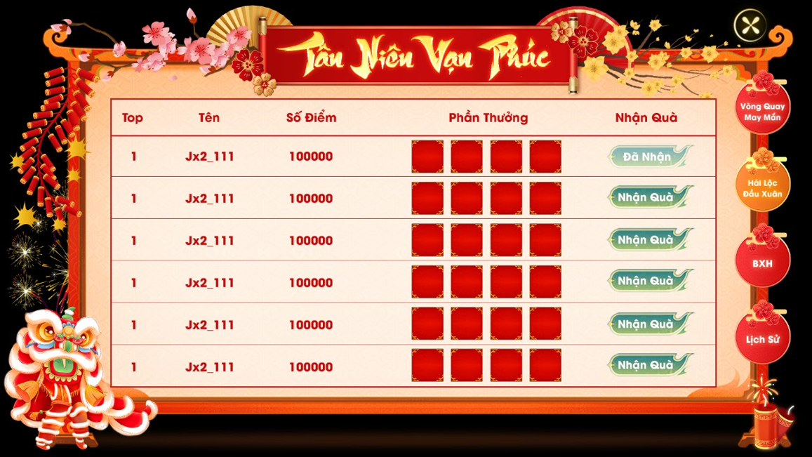 Đến thời gian nhận thưởng TOP, các người chơi đạt đủ điều kiện ấn nút để nhận thưởng. Nút nhận thưởng chỉ khả dụng khi thỏa mãn các điều kiện đạt top và sự kiện sử dụng vòng quay đã kết thúc. Quý Huynh/Tỷ vui lòng sử dụng vé trước khi sự kiện kết thúc. Số vé thừa sẽ không được hoàn trả vào sự kiện sau.