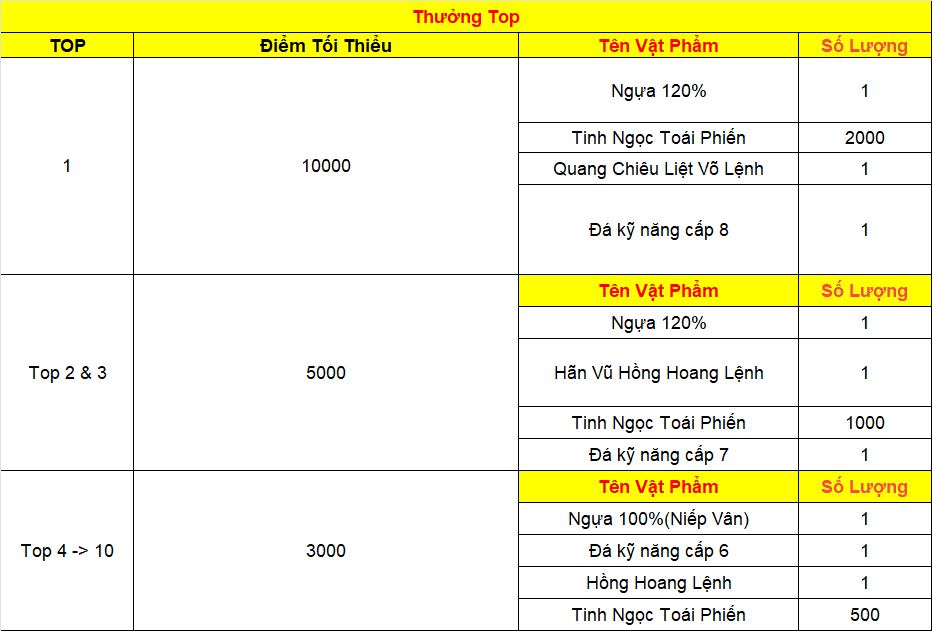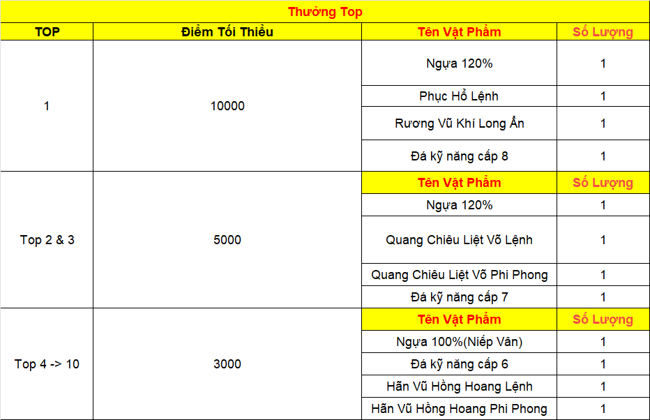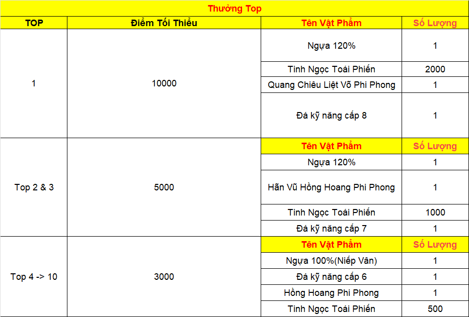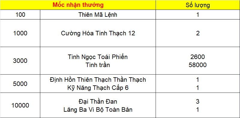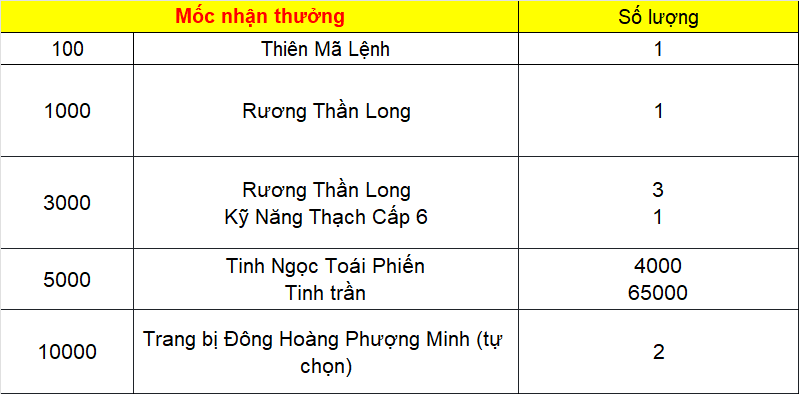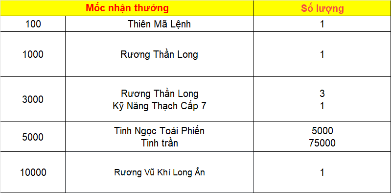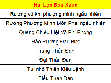 Phần thưởng máy chủ Tử Quang, Thái Hư, Hoa Sơn, Thanh Long, Tàng Kiếm, Vân Trung, Chu Tước, Bạch Hổ, Huyền Vũ, Thiếu Lâm, Thánh Linh Thành, Hưng Khánh, Hoàng Long Phủ, Táng Tuyết Thành, Đào Hoa Đảo, Tàng Long là: 2.000.000 exp và 1 phần thưởng trong các ô.