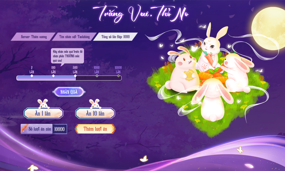Trong thời gian diễn ra sự kiện mỗi người nạp thẻ chuyển xu vào game đều có thể nhận được Cà Rốt cho thỏ ăn cà rốt.