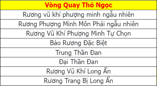 Phần thưởng máy chủ Phong Hổ, Mãnh Long và Hỏa Phụng là: 1.000.000 exp và 1 phần thưởng trong các ô.