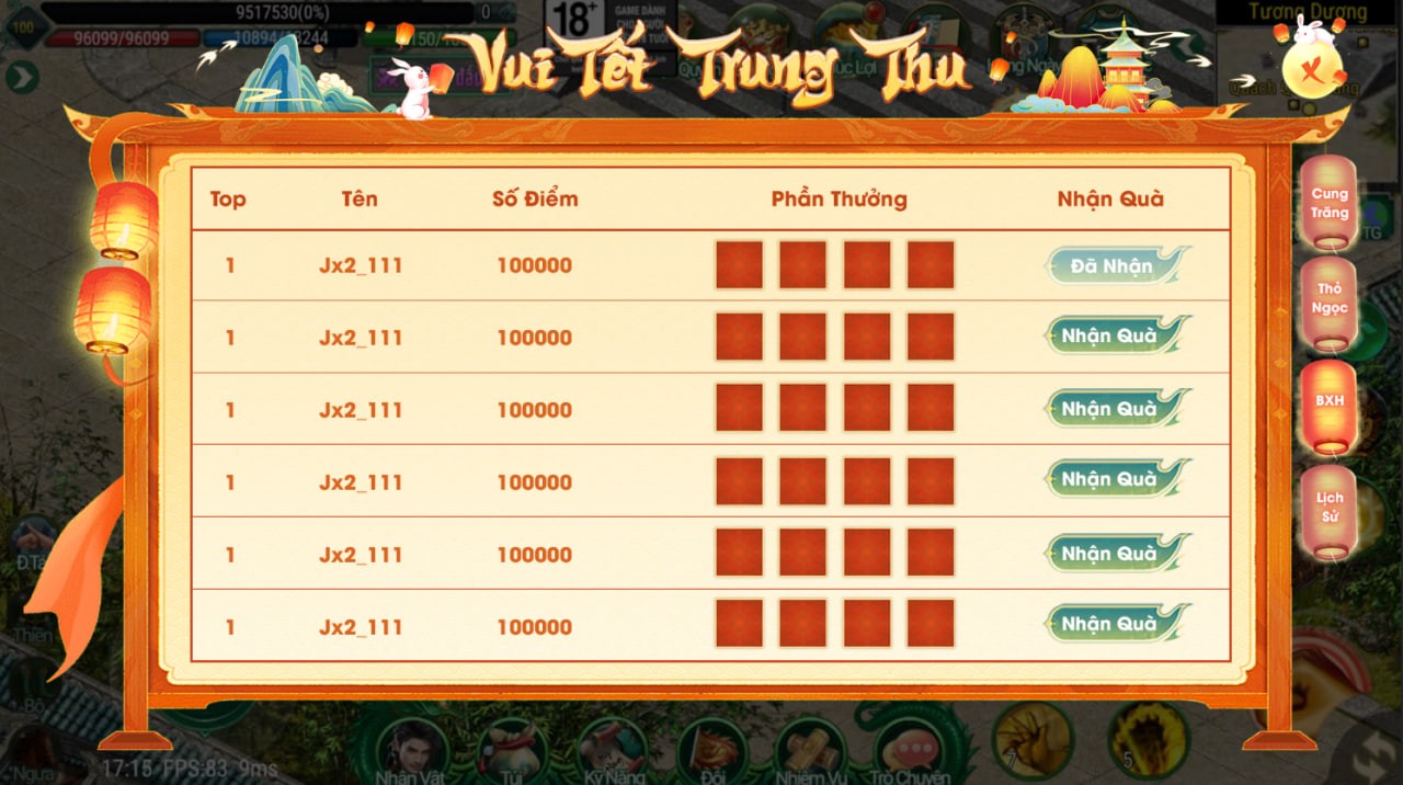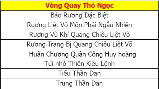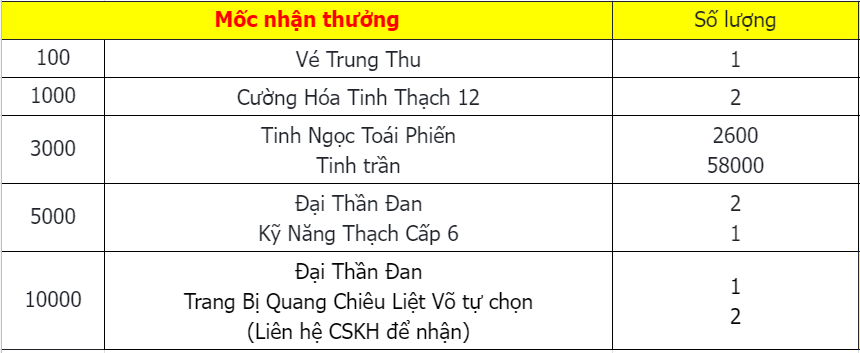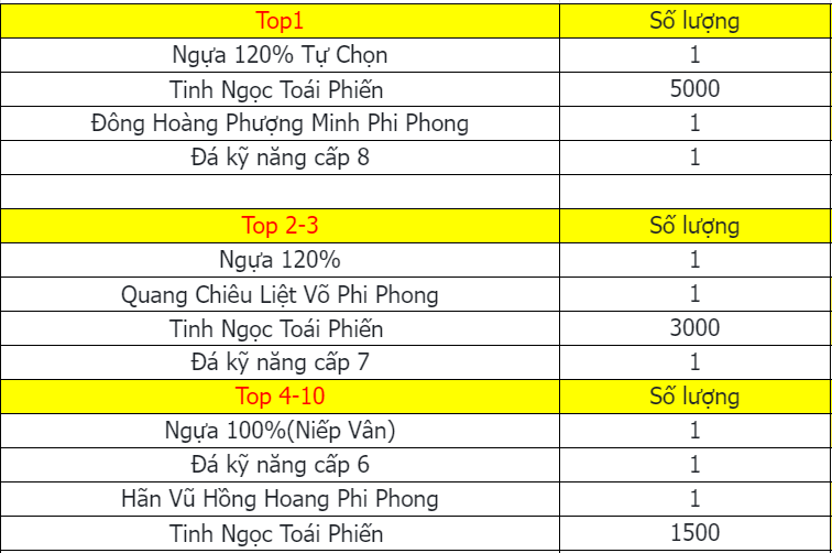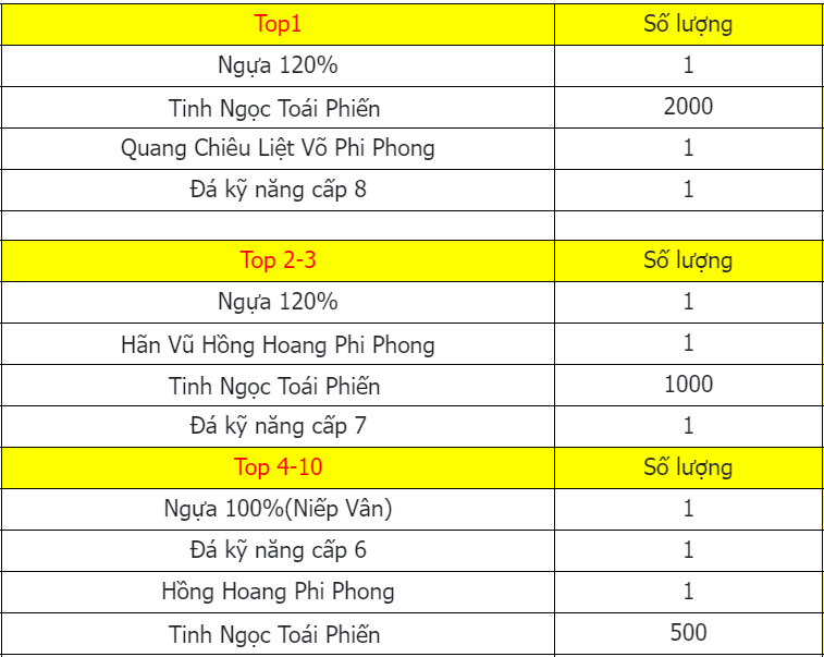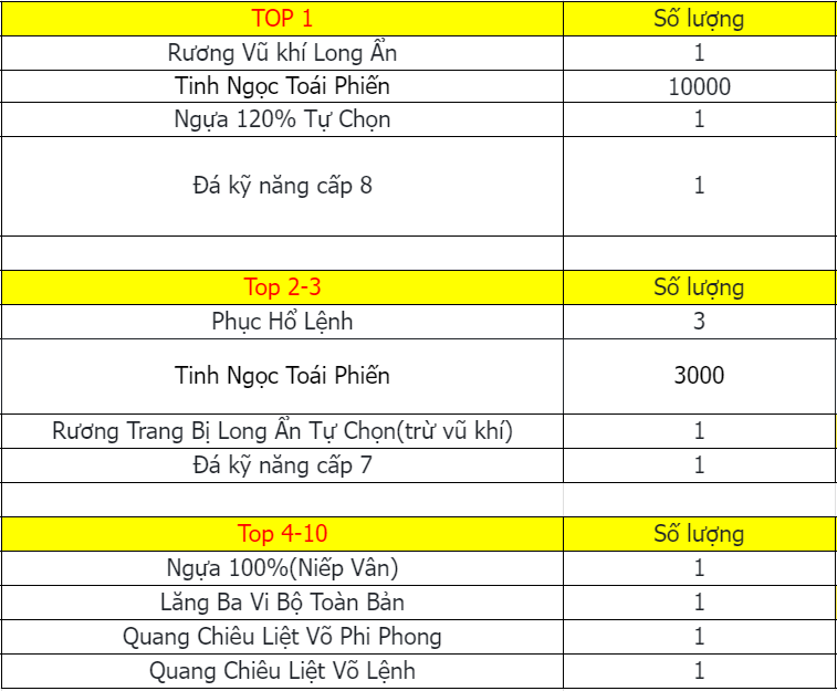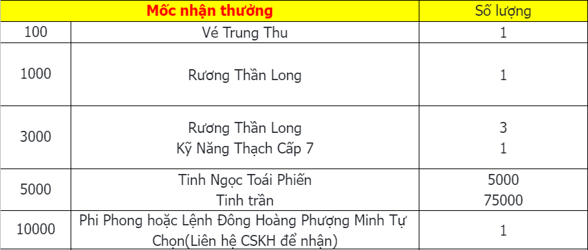 Phần thưởng máy chủ Tử Quang, Thái Hư, Hoa Sơn, Thanh Long, Tàng Kiếm, Vân Trung, Chu Tước, Bạch Hổ, Huyền Vũ, Thiếu Lâm, Thánh Linh Thành là: 2.000.000 exp và 1 phần thưởng trong các ô.