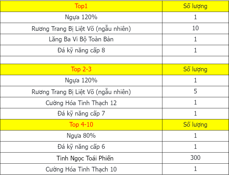 Phần thưởng máy chủ Tử Quang, Thái Hư, Hoa Sơn, Thanh Long, Tàng Kiếm, Vân Trung, Chu Tước, Bạch Hổ, Huyền Vũ, Thiếu Lâm, Thánh Linh Thành là: